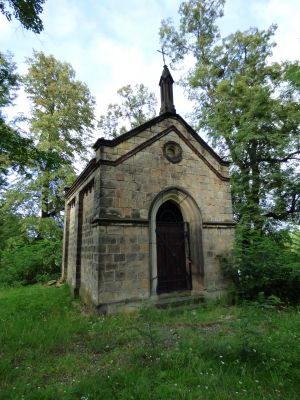 Kaplica pochodzi z roku 1860, o czym informuje wyryta data, na jednym z bloków, w lewym rogu, prawej elewacji bocznej ( "AD 1860 " ). Budowla posiada surową, neogotycką bryłę, zbudowaną z bloków, z piaskowca, przekrytą dwupołaciowym dachem, krytym już współczesną dachówką ceramiczną, typu "karpiówka". Jest to budowla murowana, z bloków z piaskowca, z kryptą, w której pochowani zostali ( według dostępnych ogólnie informacji) członkowie rodów Gemanderów i Lukasów. Otwór wejściowy do kaplicy został zwieńczony ostrym łukiem. W nim osadzone zostały dwuskrzydłowe drzwi, prześwietlone pod łukiem i stąd, w miarę możliwości, można dojrzeć niewielki fragment wnętrza.. Drzwi wejściowe, dodatkowo poprzedzają ( przypuszczam ) współczesne kraty, z uwagi na dewastację tajemniczej budowli, w latach poprzednich.