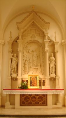 W zakrystii znajduje się ponadto ciekawa dębowa szafa z około 1915 roku. Jest to trójdzielny, dwukondygnacyjny, zaprojektowany na planie wycinka okręgu mebel w którego centrum znajduje się ruchome lustro umieszczone na cokoliku zdobionym fryzem arkadkowym, zwieńczone u góry łukiem wspartym na dwóch kolumienkach. Na szczycie łuku znajduje się krucyfiks z pozłacaną postacią Chrystusa. Do innych ciekawych obiektów w zakrystii należy rzeźba Chrystusa Frasobliwego. |