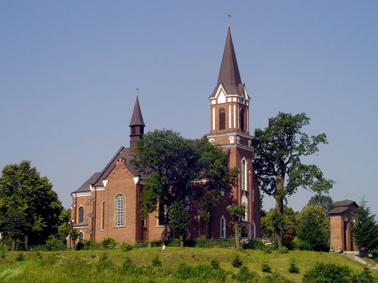 Plan budynku wykonali Władysław Chomiak i Wilhelm Szomek. Budynek wzniesiono w latach 1913–1926. Kościół jest na liście zabytków: znajdują się w nim wnetrze przeniesione z koscioła z XVIII w., zaś w do rejestru wprowadzona została także dzwonnica, obelisk nagrobny, cmentarz kościelny, plebania „stara”, szkoła parafialna i obecna organistówka.