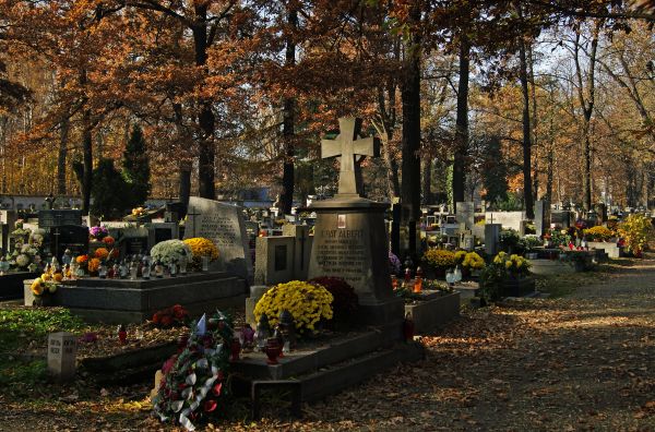 Cmentarz Rakowicki – jeden z największych cmentarzy w Krakowie o powierzchni 42 ha. Położony jest w całości na terenie Dzielnicy I Stare Miasto. Nazwa cmentarza pochodzi od nazwy drogi (obecnie ulicy Rakowickiej) wiodącej do odległej o 2 km dawnej wsi Rakowice. HistoriaWytyczany i urządzany był w latach 1800-1802 (na obszarze 5,6 ha), a czynny jest od połowy stycznia 1803 roku. Powstał na terenie podmiejskiego wówczas folwarku Bosackie we wsi Prądnik Czerwony na pograniczu Olszy, w związku z wydanym zakazem pochówków na dotychczas istniejących cmentarzach przykościelnych w obrębie miasta (edykt józefiński z 1784 roku). Teren o powierzchni 10 morgów chełmińskich za 1150 złotych reńskich wykupiły od karmelitów bosych z Czernej władze austriackie. Koszt urządzenia cmentarza pokryło miasto Kraków i okoliczne gminy: Rakowice, Prądnik Biały i Prądnik Czerwony, Olsza, Grzegórzki, Piaski, Bronowice Wielkie i Bronowice Małe, Czarna Wieś, Nowa Wieś, Krowodrza, Kawiory, którym przyznano prawo do grzebania na nim zmarłych. Pierwszy pogrzeb miał miejsce w styczniu 1803 (18-letniej Apolonii z Lubowieckich Bursikowej, zmarłej 15 stycznia 1803 roku). W 1807 r. wybudowano studnię, a w 1812 r. ze składek publicznych ufundowano okazały krzyż. Cmentarz Rakowicki był kilkakrotnie powiększany. Po raz pierwszy w 1836 r., kiedy od karmelitów czerneńskich dokupiono kolejne 10 morgów gruntu za 5 tys. zł. polskich. Rozplanowanie cmentarza zlecono architektowi, dyrektorowi wydziału budownictwa miejskiego, Karolowi R. Kremerowi, który w 1839 r. zaprojektował jego założenie parkowe. Nowo nabyty grunt poświęcono 2 listopada 1840 r. Otaczający go mur wzniesiono z materiału uzyskanego z rozbiórki kościoła Wszystkich Świętych. W 1863 roku miasto zakupiło od karmelitów i od Walerego Rzewuskiego 5 morgów i 1743 sążni gruntu, położonego przy zachodnim murze cmentarza. Poświęcono go we wrześniu 1866 r. i zaraz rozpoczęto chowanie tam zmarłych (epidemia). Kolejne poszerzenie cmentarza miało miejsce jesienią 1886 r. o ponad 15 morgów (pośrodku nowej alei pochowano Jana Matejkę oraz Macieja Jakubowskiego). Na przełomie 1933 i 1934 r. poszerzono cmentarz w kierunku północnym o dawny plac ćwiczeń saperów (ponad 15 ha) do obecnej wielkości (likwidując ulicę Modrzewiową). 6 czerwca 1856 r. wydano zezwolenie na budowę nowej kaplicy, jednak dopiero w latach 1861-1862 w centralnym punkcie cmentarza wzniesiono kaplicę pw. Zmartwychwstania Chrystusa Króla (fundacji Anny i Ludwika Helclów), na miejscu wówczas istniejącej drewnianej. W 1877 r. wzniesiono budynek administracyjny oraz kostnicę wg projektu Salomona Saarego. W 1976 r. został wpisany do rejestru zabytków. W 1981 r. powołano Obywatelski Komitet Ratowania Krakowa, w ramach którego działa komisja ds. Ratowania Cmentarzy Krakowa i Ziemi Krakowskiej. OKRK organizuje coroczne kwesty na rzecz zabytkowych grobowców i nagrobków. Prace prowadzone są na cmentarzu Rakowickim i Nowym Cmentarzu Podgórskim (przy współpracy Stowarzyszenia Podgórze.pl). OKRK gromadzi fundusze na renowację zabytkowych grobowców na specjalnym koncie. Z funduszy remontowane są groby nieposiadające dysponentów. ZnaczenieNekropolia jest miejscem pochówku krakowian, zarówno zwykłych obywateli miasta, jak i tych zasłużonych: twórców kultury, naukowców, przedstawicieli znanych rodów, działaczy niepodległościowych, politycznych i społecznych, uczestników ruchów niepodległościowych, powstań, obu wojen światowych i innych. Na cmentarzu istnieją m.in. wydzielone kwatery uczestników powstań listopadowego, styczniowego, krakowskiego, I wojny światowej (z wszystkich trzech armii zaborczych – żołnierze ci najczęściej zmarli podczas pobytu w szpitalach wojskowych), członków Legionów Polskich, uczestników szarży pod Rokitną, robotników zabitych podczas strajków w 1936, uczestników II wojny światowej, w tym żołnierzy września 1939, alianckich lotników, partyzantów, ofiar zbrodni hitlerowskich, żołnierzy radzieckich poległych podczas wyzwalania Krakowa w 1945. Cmentarz jest zabytkiem o dużej wartości historycznej i artystycznej. Część nagrobków jest dziełem znanych architektów, m.in. Teofila Żebrawskiego, Feliksa Księżarskiego, Sławomira Odrzywolskiego, Jakuba Szczepkowskiego, a także rzeźbiarzy: Tadeusza Błotnickiego, Wacława Szymanowskiego, Karola Hukana i innych. Cmentarz Rakowicki jest zarządzany razem ze znajdującym się obok, po drugiej stronie ul. J. Prandoty Cmentarzem wojskowym. Cmentarz leży w bezpośrednim sąsiedztwie trasy Małopolskiej Drogi św. Jakuba z Sandomierza do Tyńca. |
